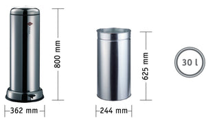 DIMENSIONS: Width: 14.25 in (362 mm) / Height: 31.49 in (800 mm) / Depth: 14.25 in (362 mm) / Volume: 30 litre INSERT DIMENSIONS: Width: 9.06 in (244 mm) / Height: 24.60 in (625 mm) / Depth: 9.06 in (244 mm)