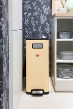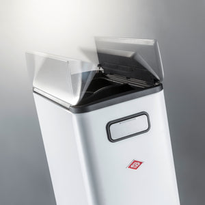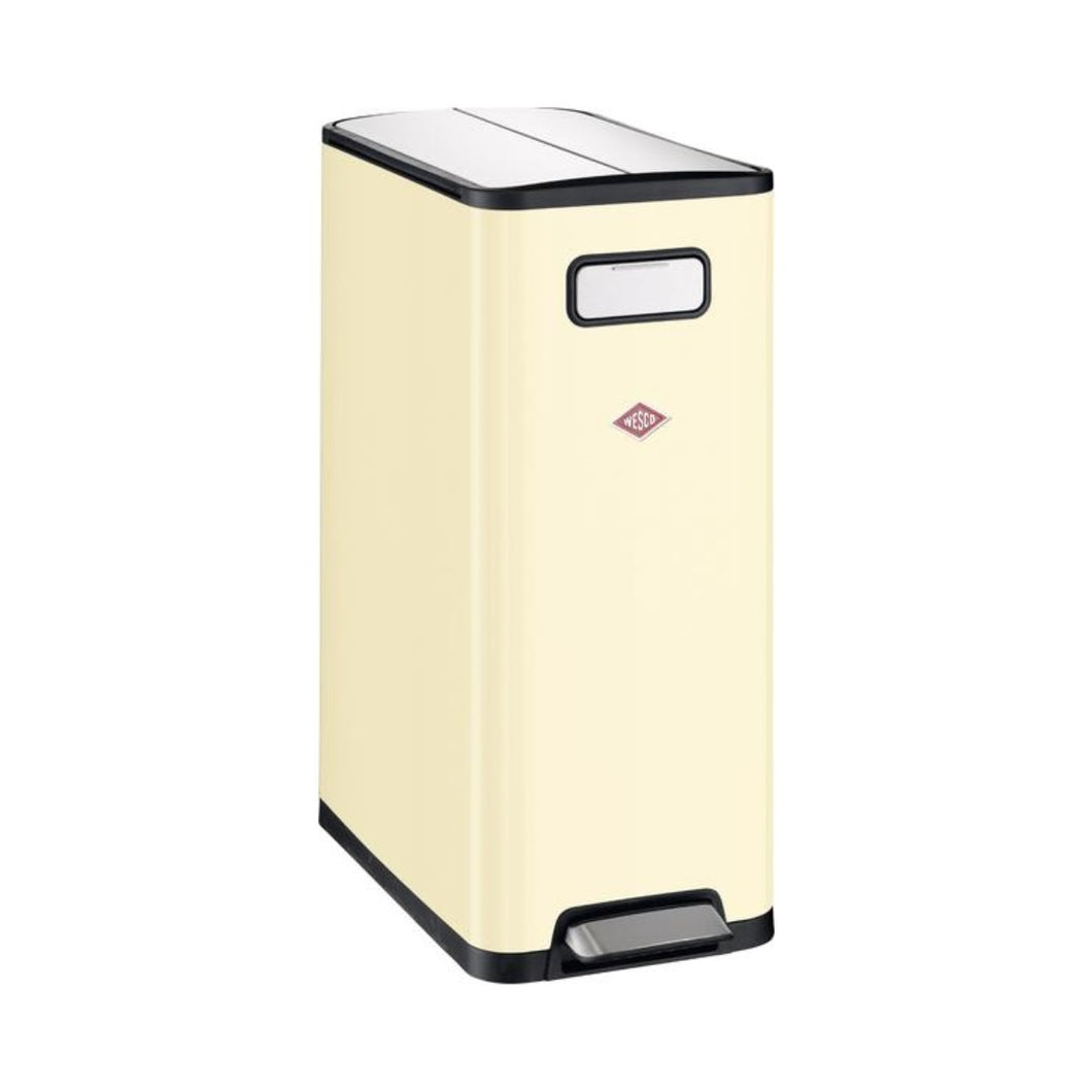 The ideal Wesco waste separator that can be placed alongside a wall or in a corner thanks to it‘s narrow shape. Two 20-litre plastic inserts tidily separate paper, glass, plastic and other waste. The stainless steel lid is divided into two parts and closes soundlessly thanks to a built-in damper. It can be fixed in the open position. The large stainless steel pedal guarantees easy operation. Two wheels underneath the bin ensure easy movement of the bin.