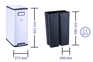 DIMENSIONS: Width: 10.82 in (275 mm) / Height: 26.02 in (661 mm) / Depth: 20.94 in (532 mm) / Volume: 2x 20 litre INSERT DIMENSIONS: Width: 7.87 in (200 mm) / Height: 23.22 in (590 mm)